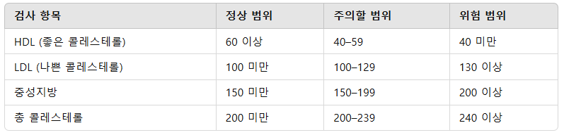 - 흡연은 HDL(좋은 콜레스테롤)을 감소시키고, 음주는 중성지방을 급격히 높일 수 있습니다.